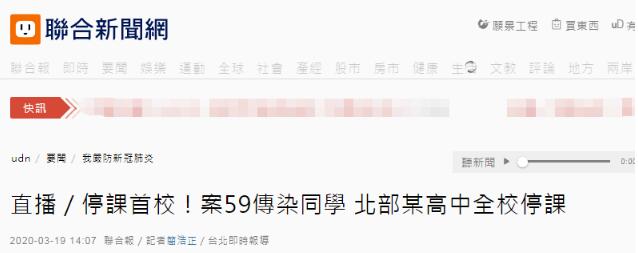 报道称,台湾北部一名高中生(第59例病例)日前确诊感染新冠肺炎,其所在班级全班停课。台湾地区流行疫情指挥中心今天(19日)证实,该高中生的同班同学也确诊,已达到全校停课标准。台教育部门负责人潘文忠称,该校1650名学生、154名教职员受影响,将进行50%在线课程、50%自主在线学习。