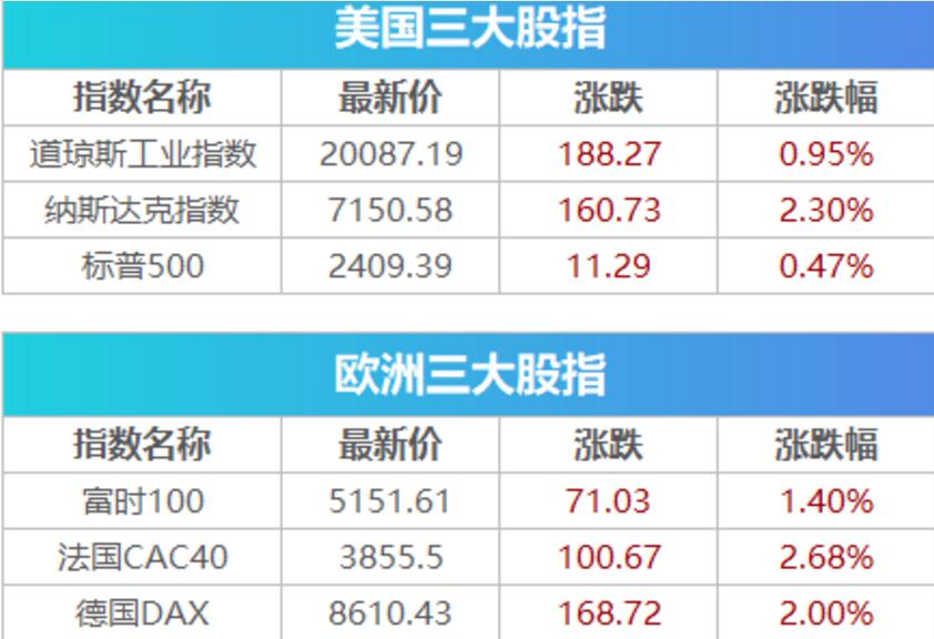 欧股尾盘快速拉升收复日内失地,对刺激政策的期望提振市场情绪。截至收盘,泛欧斯托克600指数涨2.29%,报286.06点,英国富时100指数涨0.90%,报5126.32点,德国DAX 30指数涨1.60%,报8577.06点,法国CAC 4O指数涨1.66%,报收于3817.02点。