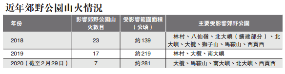 未到清明節,山火就已頻頻發生,漁農自然護理署提供的資料顯示,截至今年2月底,郊野公園內發生或威脅郊野公園的山火數目雖然只有7宗,但受影響範圍面積達281公頃,相比2019年及2018年的面積都大幅增加(見附表)。南大嶼、北大嶼、大欖、西貢西、林村及馬鞍山等郊野公園都是頻發點。2月23日馬鞍山郊野公園鹿巢山一帶的山火最觸目驚心,範圍廣泛,險波及馬鞍山村,幸風向不吹正,有驚無險。鹿巢山山火受影響範圍面積約80公頃,其中約55公頃屬郊野公園範圍。另一處行山熱門地點東大古道,近大澳的象山一帶1月31日下午也發生山火,受影響範圍的面積約12公頃,古道邊植被盡失,露出嶙峋泥石。