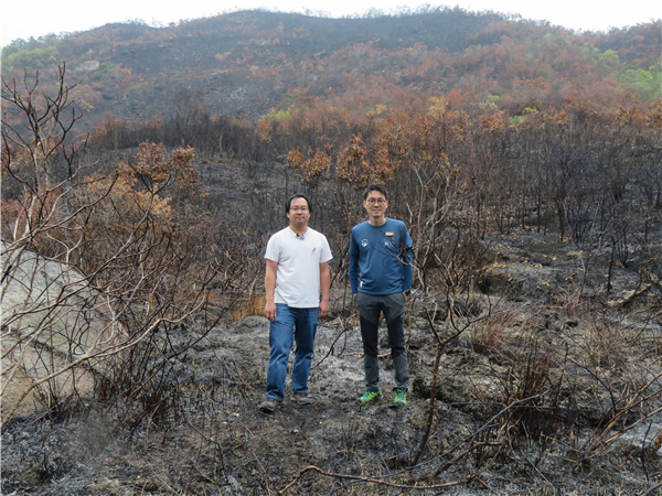 中大地理及資源管理學系副教授黎育科(左)與信義會鞍山探索館服務經理樊文韜視察災後鹿巢山,黎指當地需植樹復原,但首要防止山火再發生。 記者 鄭玉君攝