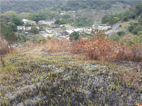 山火過後,接近馬鞍山村的山頭留下焚燒痕迹。