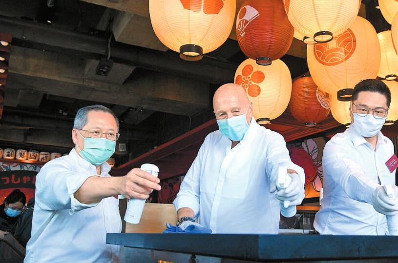 蘭桂坊集團主席盛智文(中) 與飲食界立法會議員張宇人(左) 昨日到蘭桂坊,向食肆派發納米光觸媒消毒劑,並即場試用清潔餐桌。記者蔡啟文攝