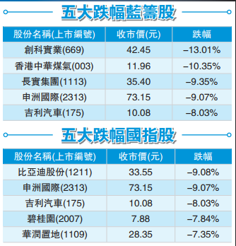 藍籌股全軍覆沒,騰訊(700)挫3.2%;汇控(005)插6%;友邦(1299)跌5.3%;建行(939)跌2.6%;花旗將港交所(388)升級至「買入」,收市仍跌3%。市場擔心美國疫情加劇拖累經濟重創甚或衰退,創科實業(669)全日大跌13.01%至42.45元,為表現最差藍籌;申洲國際(2313)去年純利升12%,但毛利率跌至30.3%,全日挫9.07%至73.15元。另外,中華煤氣(003)上周減派紅股,昨日跌10.35%至11.96元,兩日累跌17.97%;九置(1997)跌1.32%,已是表現最佳的藍籌。