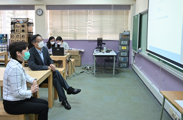林鄭月娥聽取校長邱少雄介紹學校在停課期間,運用不同的電子學習軟件,以保持學生的學習動力和興趣。她亦視察了該校老師透過網上視訊會議軟件與中六學生進行實時上課,並在中一同學的網上小組討論環節與他們交談,了解他們的學習情況。