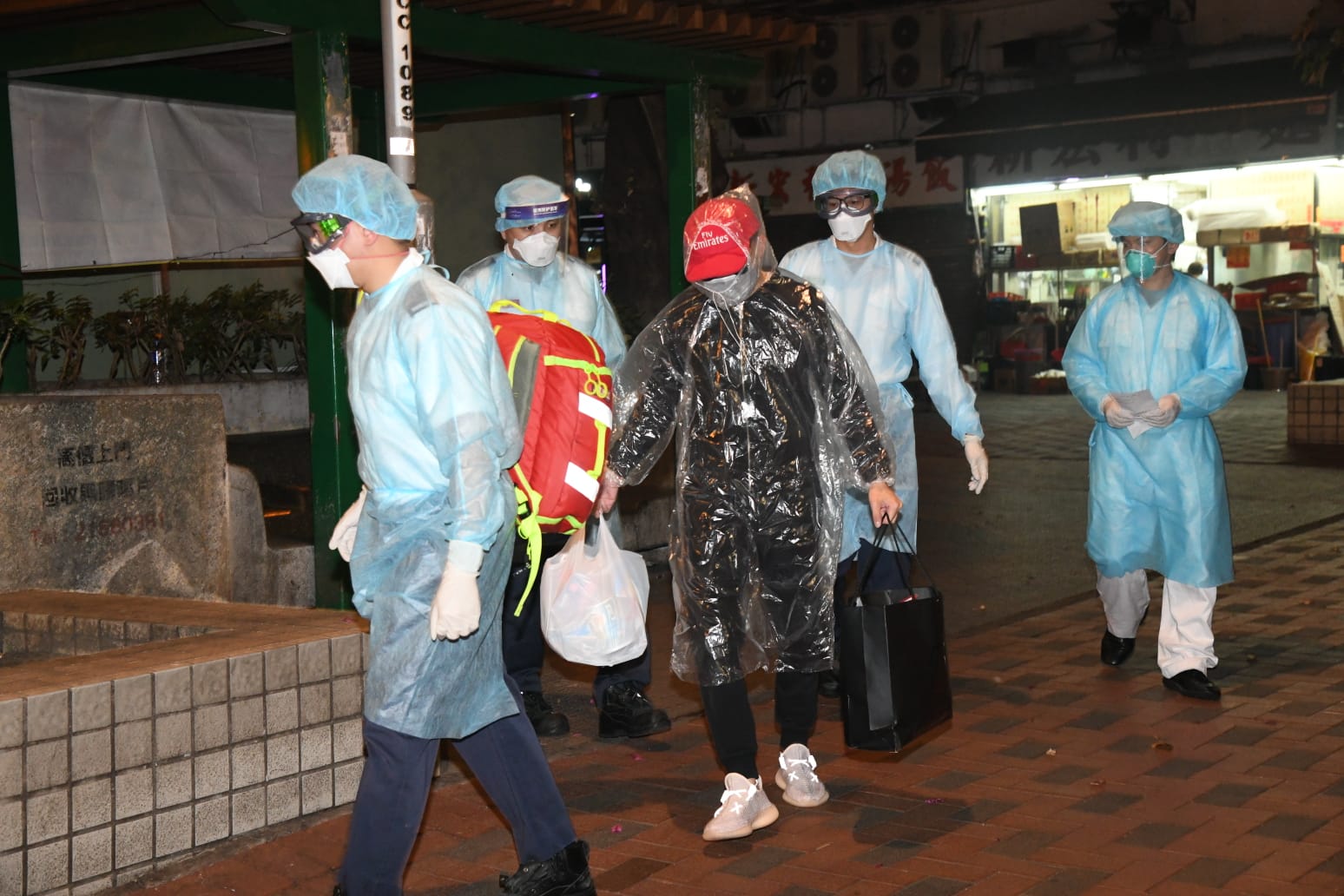 無獨有偶,今天凌晨,在荃灣,一名手戴檢疫手帶的男子,被發現和數名友人,在路德圍40號一間車仔麵店用膳,同場食客報警求助。警員聞訊抵達現場,發現24歲的何姓男子有發燒徵狀,其友知悉後立即憂心忡忡,並即時戴回口罩,身穿防護服的衞生署人員趕至處理,幫其測量體溫,經多次耳探測試,發現他正在發高燒,於是立刻召救護車到場,將他送往仁濟醫院治理。