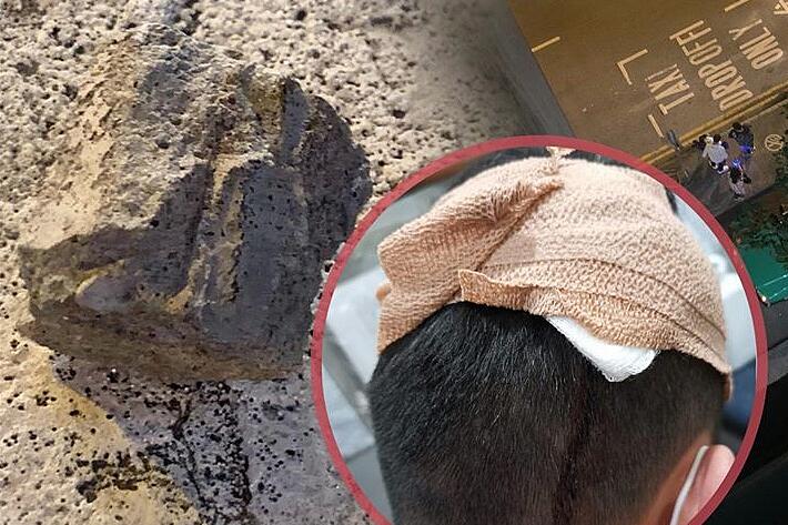 涉案警員被石頭擊中頭部受傷。(警方Facebook專頁圖片)