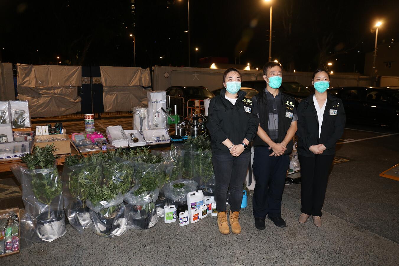 警方於麻種植場檢獲大批大麻及製成品,西九龍總區刑事警司鍾雅倫(右二)指疑犯透過網上平台將大麻製成品售予年青人。