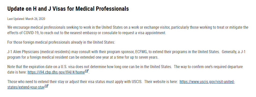 美国国务院领事事务局也在其官网发布了这则消息,并且具体列出了上述医疗人员可以办理的两类签证类型,一类是H签,即签发给赴美短期工作的申请人;另一类是J-1签,这类签证主要针对目前已经在美的外国医疗专业人员,J-1签通常可一次延长一年,最长可达7年。