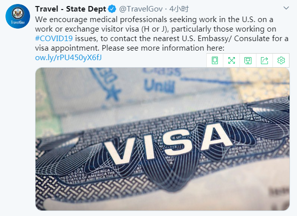 文中写道,“我们鼓励寻求在美工作或交流的专业医疗人员,尤其是那些致力于治疗或缓解新冠肺炎疫情的专业人员,与就近使馆或领事馆联系申请签证”。