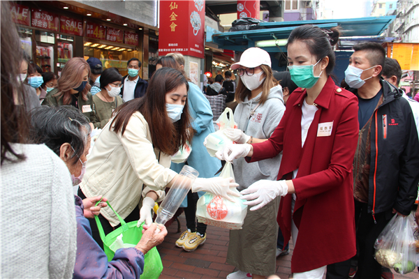 賴楚惠身體力行向街坊派發飯盒等物資。