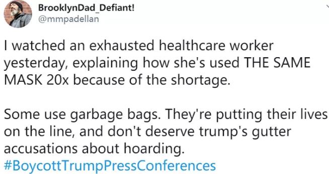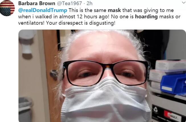 一位疑似医护人员的网友向特朗普开火:“快12个小时,我还在用着这个口罩,没人在囤口罩或者呼吸机,你(对医护人员)的不尊重让人恶心!”