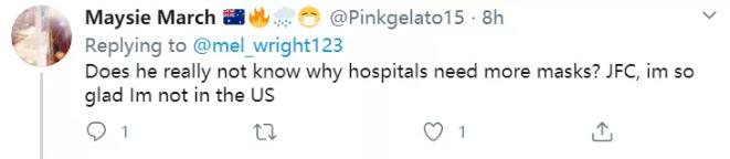 一位疑似来自澳大利亚的网友称:“医院为什么需要更多口罩,他自己心里没数吗?真TM幸运,我很高兴自己不在美国。”