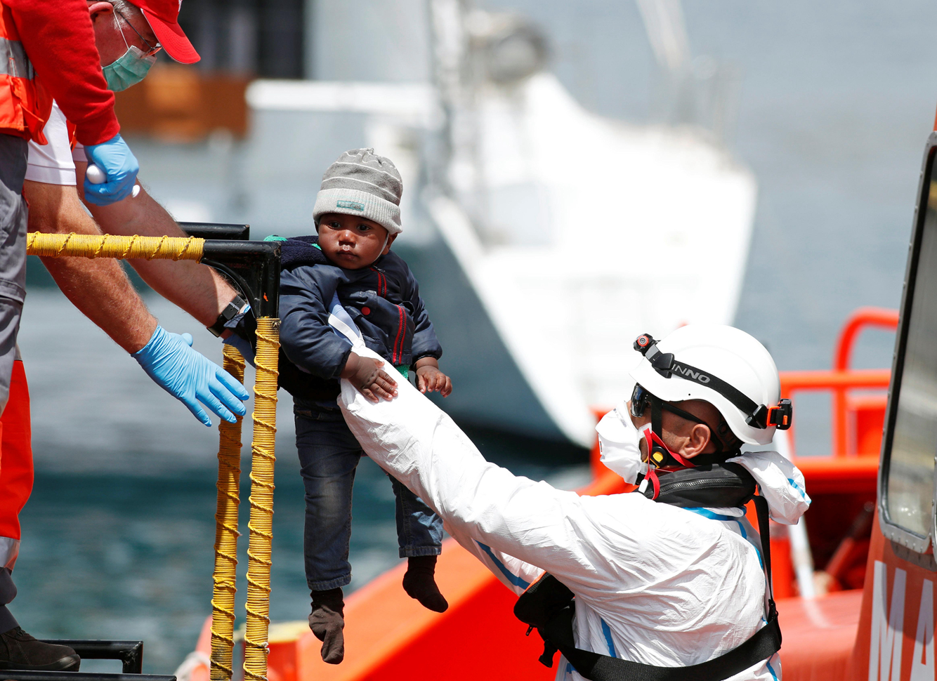 歐盟國家在疲於抗疫的同時,還不得不防範難民營爆發疫情。圖為在西班牙阿爾吉內金港, 檢疫人員把一名隨家人非法入境的難民兒童接上岸。路透社