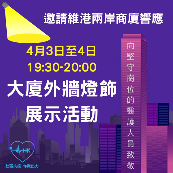 【香港商報网訊】疫情嚴峻,前線醫護人員日夜不停與疫症搏鬥。「全港社區抗疫連線」宣布,發起「向堅守崗位的醫護人員致敬——大廈外牆燈飾標語展示活動」,邀請維港兩岸商廈響應,於今、明兩晚7時半至8時正,在各大廈外牆燈飾展示「向堅守崗位的醫護人員致敬」、「齊抗疫愛香港」、「醫護緊守崗位我們留家抗疫」、「團結同心齊抗疫珍惜香港是我家」、「齊心抗疫你我出力」、「戰勝疫情守護香港」等正面信息,為在最前線對抗疫症的醫生及護士送暖打氣。「連線」希望,透過此活動傳遞正能量,振奮前線醫護士氣,促進社會和諧。