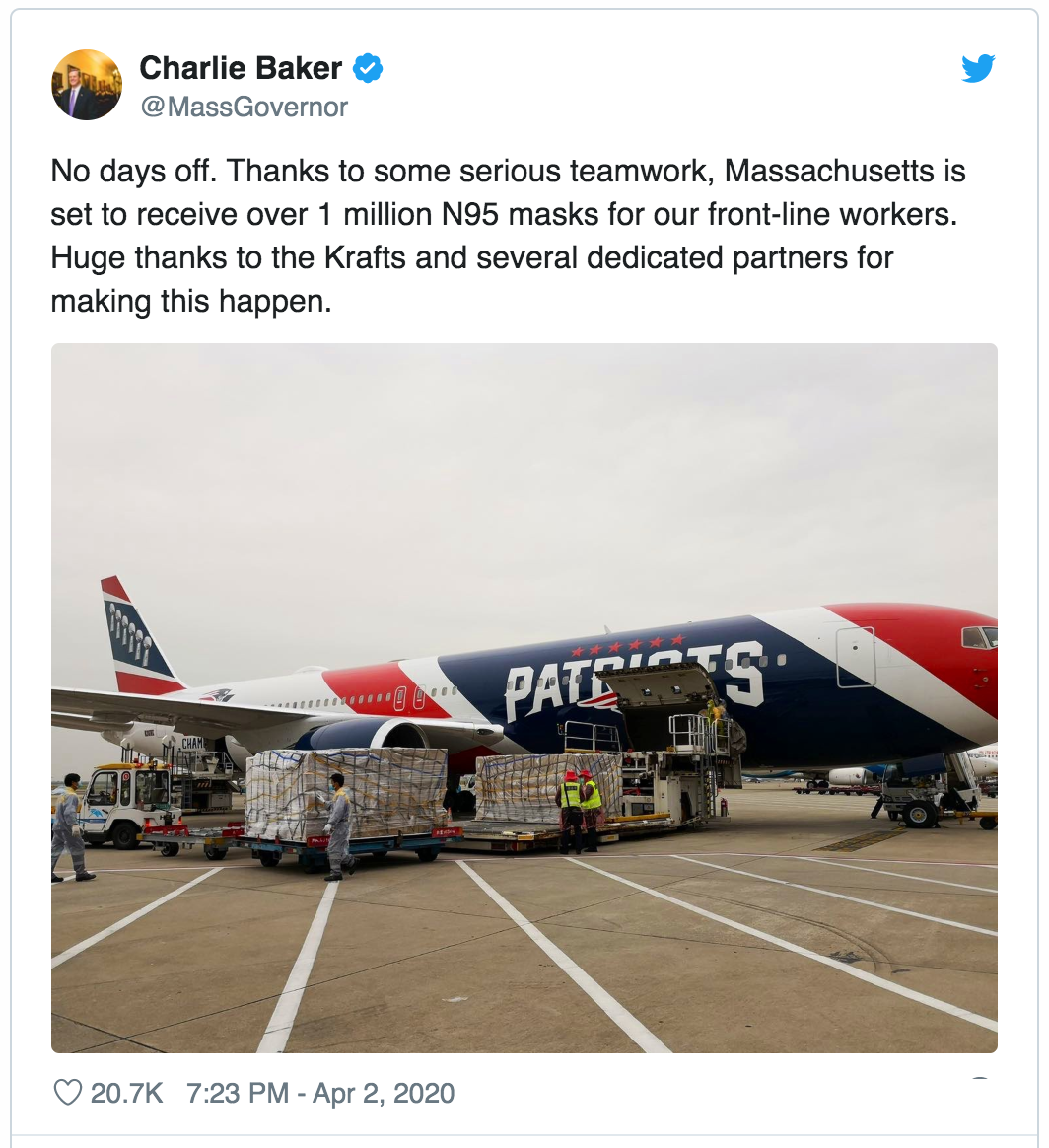 大約兩周前,馬薩諸塞州州長查理·貝克(Charlie Baker)眼見疫情愈發嚴重而物資嚴重不足,親自安排向中國企業訂購約100萬隻N95口罩等醫療物資,但他發愁怎樣將這批臨時貨物運回波士頓。此時,美國與中國的民航早已斷航,臨時安排空運也困難重重。