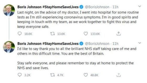 欧洲理事会主席米歇尔发文称,“祝鲍里斯·约翰逊早日康复。在这个艰难的时刻,我们与他的家人及英国人民同在。祝你早日康复,鲍里斯。”