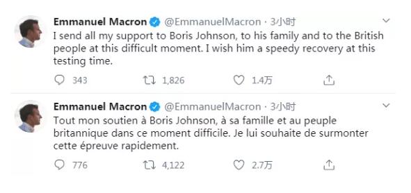 当地时间4月6日,得知约翰逊病情加重的消息后,马克龙先后用法语和英语发推称,“在这艰难时刻,我向鲍里斯·约翰逊、他的家人和英国人民致以我全部的支持。在这困难时期,我希望他能尽快康复。”
