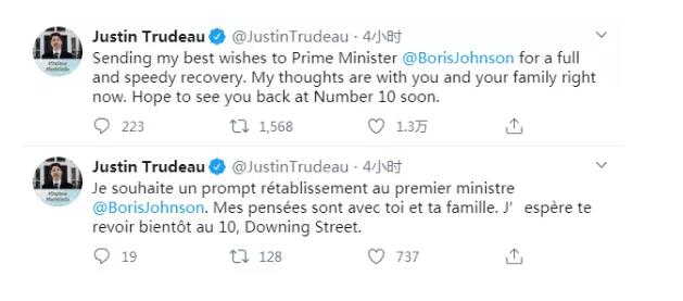加拿大总理特鲁多表示,“我谨向英国首相鲍里斯·约翰逊致以最好的祝愿,希望他尽快康复。此刻,我的心与你和你的家人同在。希望早日看到你重返唐宁街10号”。