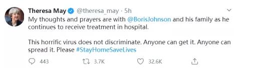英国前首相特蕾莎·梅也在推特上对首相约翰逊表达祝福。她称,“约翰逊正在医院继续接受治疗,我的关心和祈祷与他和他的家人同在。这种可怕的病毒(新冠病毒)不会区别待人,任何人都会被感染,任何人也可以传播它。请居家隔离,拯救生命。”