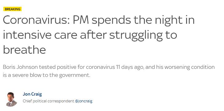 在报道中,“天空新闻”政治新闻部编辑贝丝·里格比(Beth Rigby)描述约翰逊的最新情况说:“不得不给他供氧——因为他呼吸困难。将首相转移到重症监护室的决定,是在(当地时间6日)晚7点做出的。”据“天空新闻”了解,将首相转移到重症监护室的决定,是由他的医疗团队在其病情恶化后做出的决定。