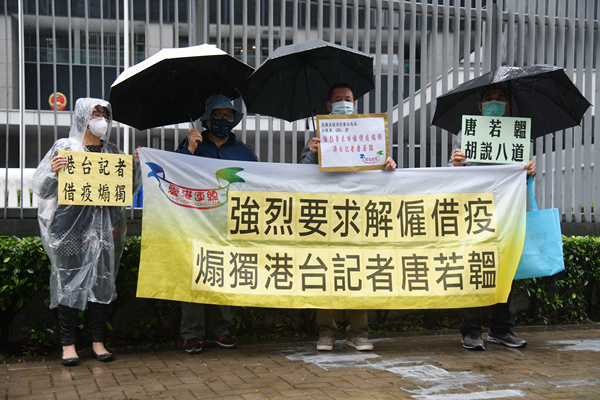【香港商报网讯】「愛港連線」及「愛國者同盟」兩個團體昨日分別到政府總部請願(圖),批評香港電台多年來在其播放的節目中,不時出現反政府、煽動市民不滿政府之聲音,更加不能容忍的是電台記者唐若韞違背「一國兩制」原則,公然煽惑「港獨」、分裂國家言行,而電台台長作為公職人員沒採取任何行動。他們強烈譴責香港電台及唐若韞,並向商務及經濟發展局遞交請願信,要求對香港電台採取必要措施,杜絕類似事件再次發生,並解僱唐若韞。記者 蔡啟文攝