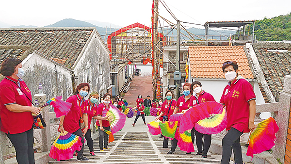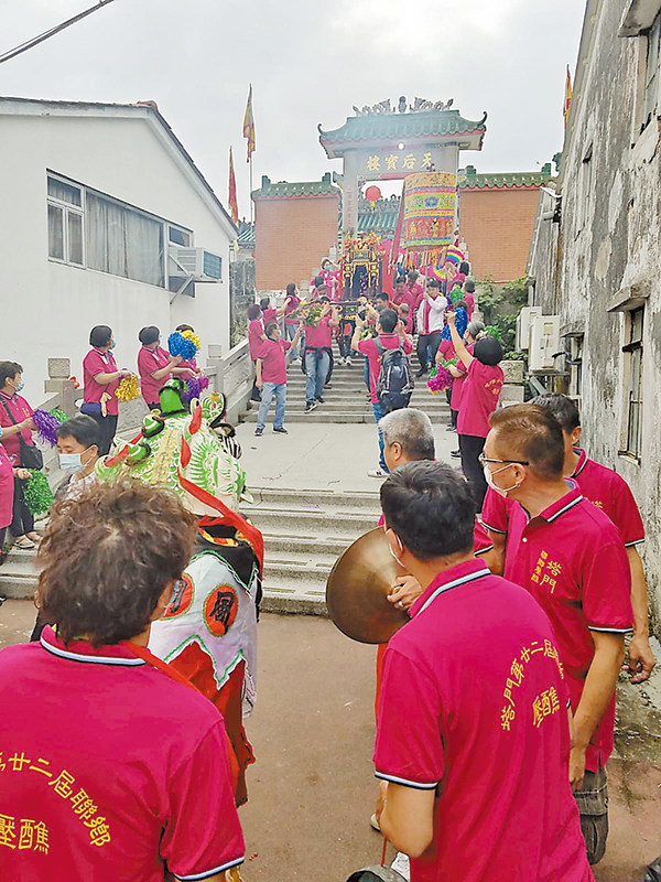 村民從天后古廟請出天后娘娘神像入神轎,抬往醮場臨時神棚(下圖),沿途銅鑼開道,婦女們夾道划龍舟舞表演(上圖)。大會提供圖片