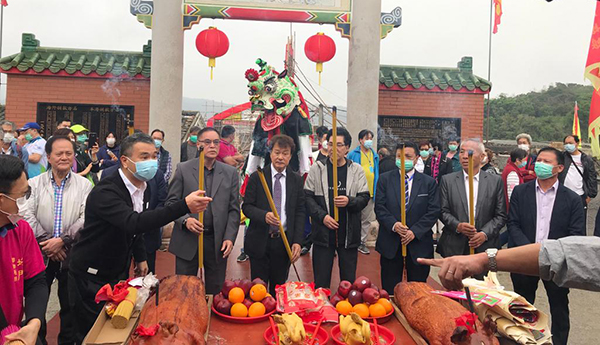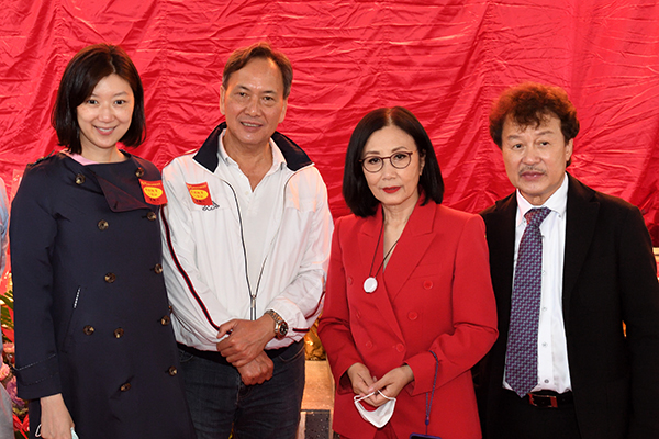 立法會議員容海恩(左一)、 西貢北約鄉事委員會主席李耀斌(左二)、 八和會館主席汪明荃(右二)登島為壓醮活動打氣,右為壓醮委員會會長何大偉。大會提供圖片