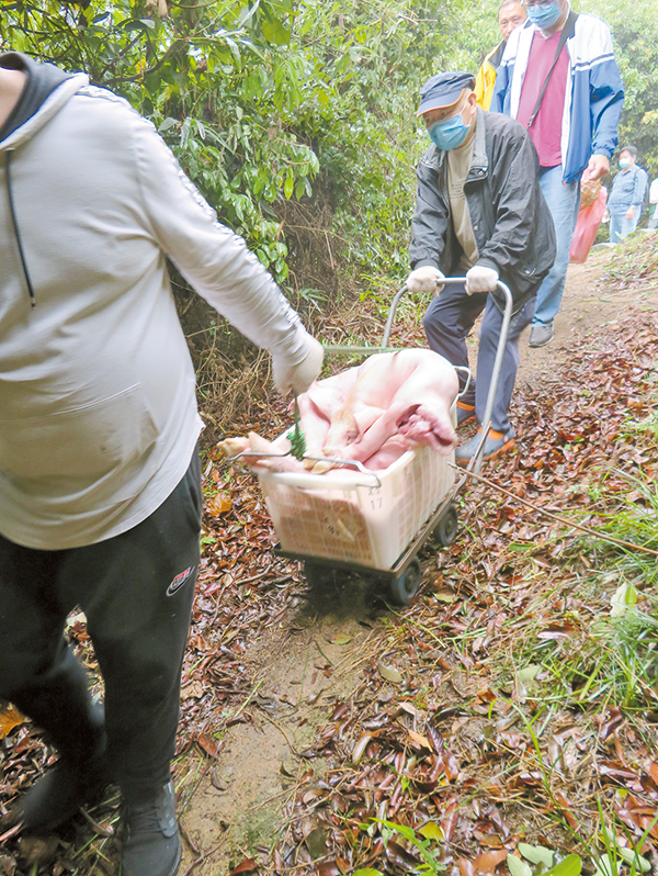 拜祭完畢的生豬運回屏山祠堂,分給曾到山頭的子孫。