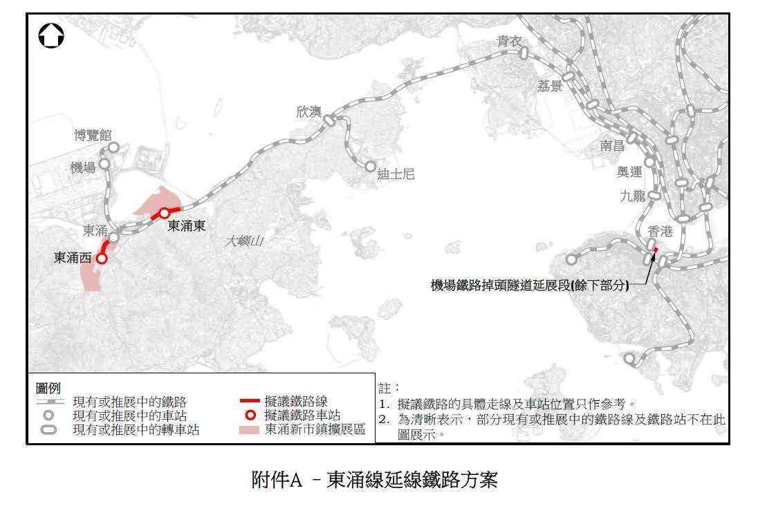 政府發言人說,東涌線延線是《鐵路發展策略2014》中建議的七個鐵路方案之一,工程包括將現有東涌線從東涌站伸延約1.3公里至東涌西地區,並增設一個新鐵路站;東涌東站則為欣澳站與東涌站之間的新增中途站,及於香港站東面建造機場鐵路掉頭隧道延展段(餘下部分),讓列車於該處掉頭以提升列車運行效率及班次。