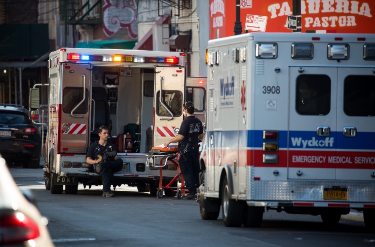 在美国一家医院外,医护人员在救护车旁待命。新华社