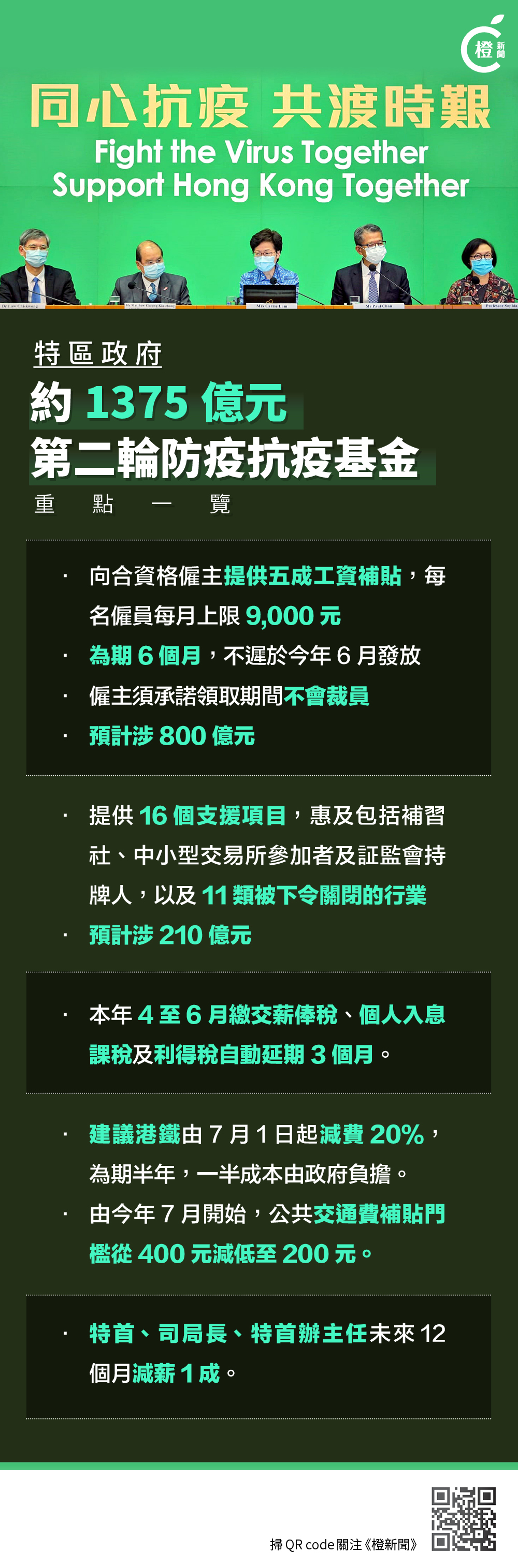 林鄭月娥續指,政府亦會向強積金不涵蓋的飲食、建造、運輸業僱主提供支援,向自僱強積金供款人士提供一筆過資助,亦會放寬綜援資產上限,協助失業人士,為期半年。