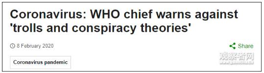 台当局“外交部长”吴钊燮底曾在2月6日于社交媒体辱骂世卫组织,称“你有什么毛病(What's wrong with you)?”2月8日,谭德赛发声呼吁全世界警惕网络水军和阴谋论。“世卫组织现在不光要抗击病毒,同样也在应对针对我们的水军和阴谋论。”
