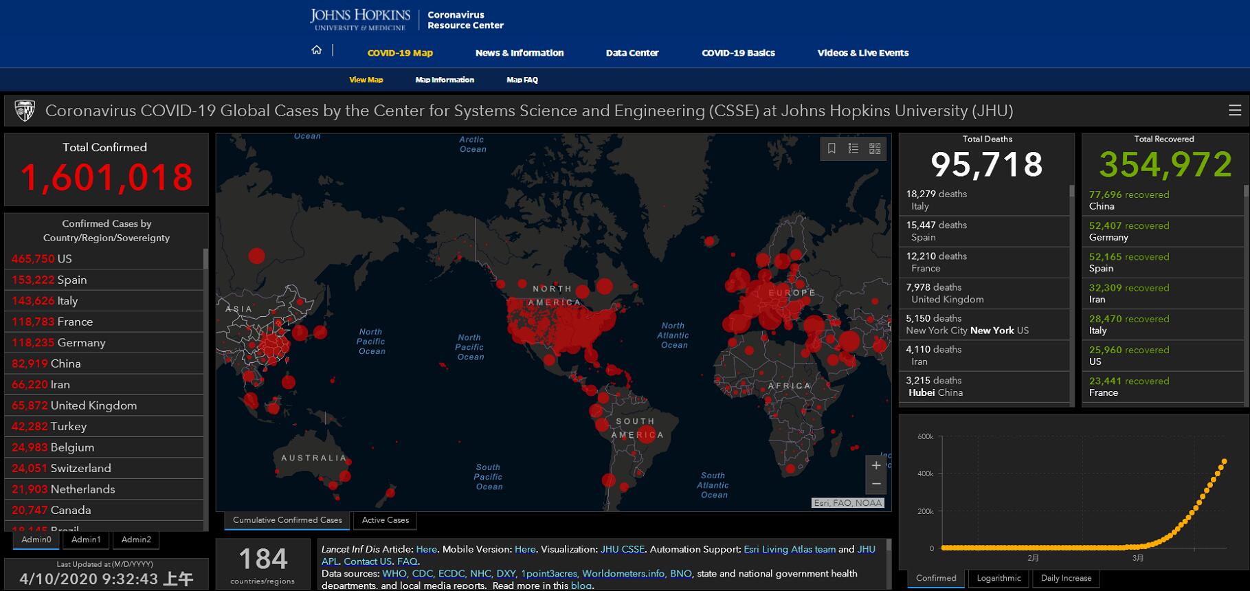 约翰斯·霍普金斯大学统计数据显示,截至香港时间4月10日9时32分,全球累计确诊病例1601018例,累计死亡95718例。其中,美国累计确诊病例465750例,累计死亡16672例,是目前感染病例数最多的国家。西班牙累计确诊153222例,死亡15447例。意大利累计确诊143626例,死亡18279例。法国累计确诊118783例,死亡12228例。德国累计确诊118235例,死亡2607例。