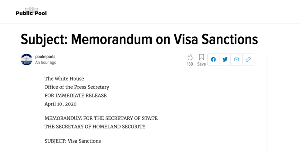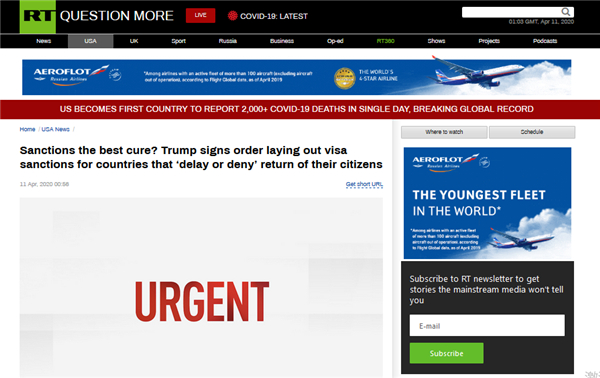 【香港商报网讯】俄罗斯RT电视台刚刚消息,美国总统特朗普已经签署一项命令,即以“公共卫生风险为由”,对那些不愿让本国公民或居民离美回国的国家实施处罚,具体是对“拖延或拒绝”本国公民回国的国家实施签证制裁。RT还在报道标题中质问:制裁是最好的良药?