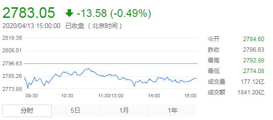 【香港商报网讯】4月13日(周一),農历三月廿一,今日早盤,三大股指全線低開後震蕩盤整,截至收盤,沪指报2783.05点,跌0.49%,成交额为1841亿元;深成指报10223.16点,跌0.73%,成交额为3149亿元;创指报1923.08点,跌1.37%,成交额为1081亿元。两市成交额不足5000亿元,创去年12月25日以来新低。受消息面影响,江西本地股有所异动,医药、军工板块先后拉升。高位个股大幅下杀,跌停个股近40家,科技股全线走弱。