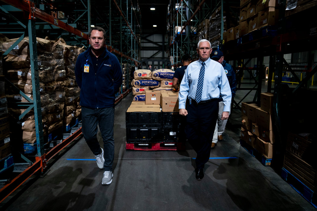 副总统迈克·彭斯本月参观了位于弗吉尼亚州戈登斯维尔的沃尔玛配送中心。特朗普与美国卫生与公众服务部部长亚历克斯·M·阿扎尔二世发生冲突后,彭斯被任命为政府新冠病毒工作组负责人。 ANNA MONEYMAKER/THE NEW YORK TIMES
