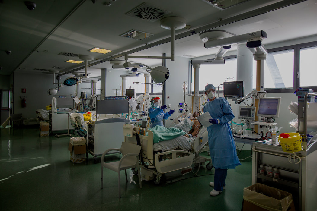 上个月,意大利贝加莫若望二十三世医院重症监护病房中的新冠肺炎重症患者。 FABIO BUCCIARELLI FOR THE NEW YORK TIMES