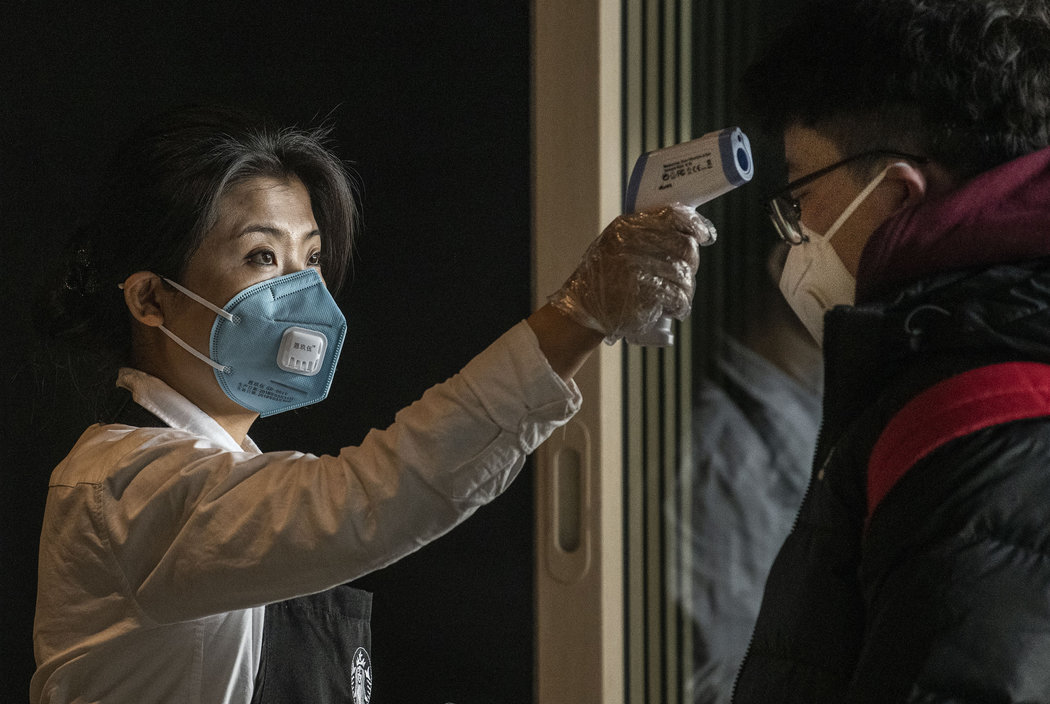 一月,北京一座机场内的星巴克员工在给顾客量体温。 KEVIN FRAYER/GETTY IMAGES