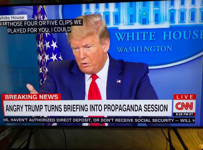 据美国《国会山报》报道,CNN在注意到疫情简报会内容出现变化后,将题目改成了“气愤的特朗普将简报会变成了政治宣传”,并切断了直播。CNN主持人约翰·金(John King)说道:“在白宫简报室里花纳税人的钱播放政治宣传视频,这还是头一回。”