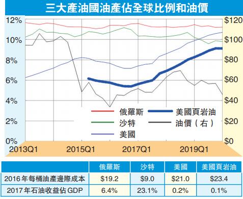 圖中所見,自2016年油價穿30美元起,沙特顯然願意減產,但美國則不斷增產,而俄羅斯變化不大──這非推測,而是三國由行動來告知世人的。從《華爾街日報》於2016年表列的產油成本所見,美、俄皆在每桶20美元上下,頁岩油也大概在這水平,反而沙特每桶不用10美元,由此路進,照計沙特最能打油價戰,目前油價仍賺逾倍。