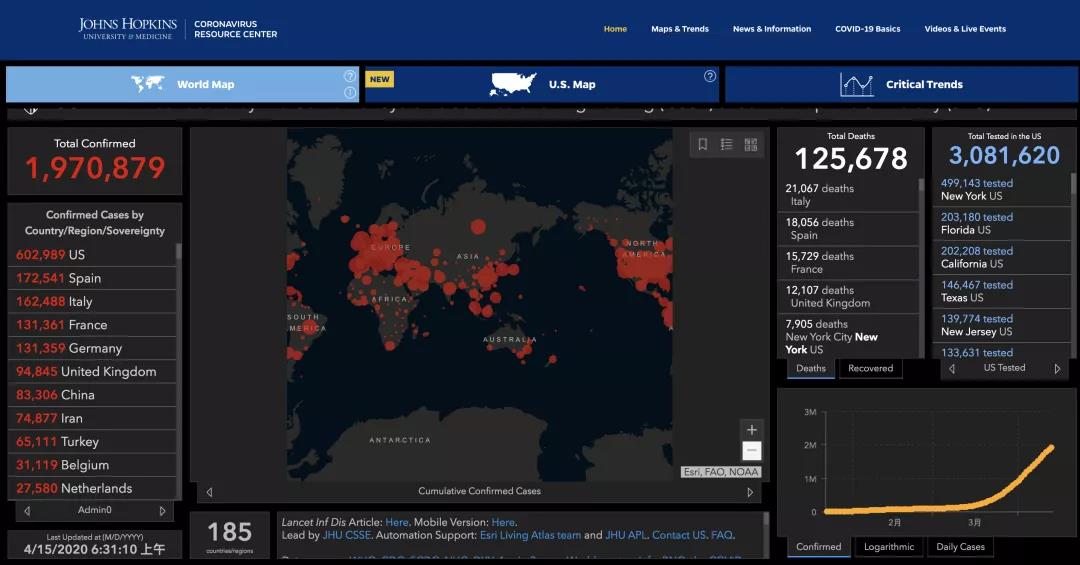 【香港商报网讯】根據美國約翰斯・霍普金斯大學(Johns Hopkins University)的即時統計數據顯示,截至香港時間4月15日早上7時41分,全球新增42,935宗病例,累計確診個案為1,973,715宗,死亡病例增加5,460宗,累計數字為125,910宗。