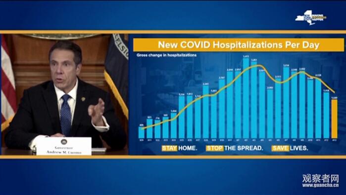 客观来讲,纽约州的疫情防控工作似乎也初见成果。科莫在昨日的记者会上透露,纽约州住院人数自疫情暴发以来,首次出现下降。不过在纳入“病死家中”的患者数据后,纽约州每日新增病死数依旧不断攀升。“我们正站在疫情的峰值上,”科莫表示。