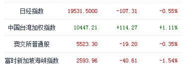 亚太股市方面,日经指数收盘下跌107点,报19531点。