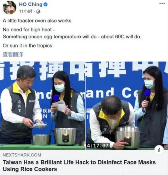14日,何晶分享了民进党当局教民众用电饭锅给口罩消毒的新闻,评论道:“其实用小烤箱(消毒口罩)也可以,不需要太高的温度,大概就能够煮出温泉蛋的60℃就行了,或者你在热带地区晒晒。”