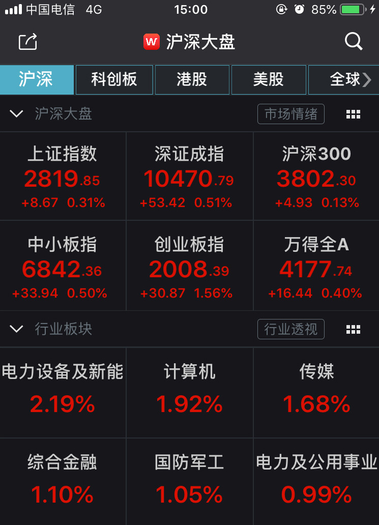【香港商报网讯】两市低开高走,三大股指全线翻红,创业板指收复2000点大关。截至收盘,沪指涨0.31%,深成指涨0.51%,创业板指涨1.56%。
