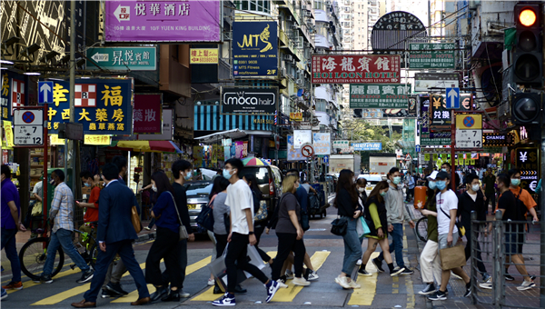 本港疫情稍放緩,昨日旺角街頭即見不少市民購物,對防疫鬆懈起來。中新社