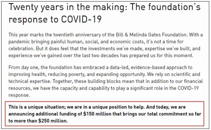 该基金会成立于2000年,今年恰逢20周年。他表示:“疫情带来痛苦的社会和经济代价,现在不是庆祝的时候。但我们感到,我们在过去20年里所做的投资、积累的专业知识和经验为这一时刻做好了准备。”