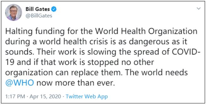 在特朗普宣布“断供”当天,比尔·盖茨在推特公开发文谴责。他写道:“在世界卫生危机期间停止资助,就如听起来那样危险。他们(世卫组织)的工作减缓了疫情传播,如果停止这项工作,没有其他组织可以取代他们。世界比以往任何时候都更需要世卫组织。”