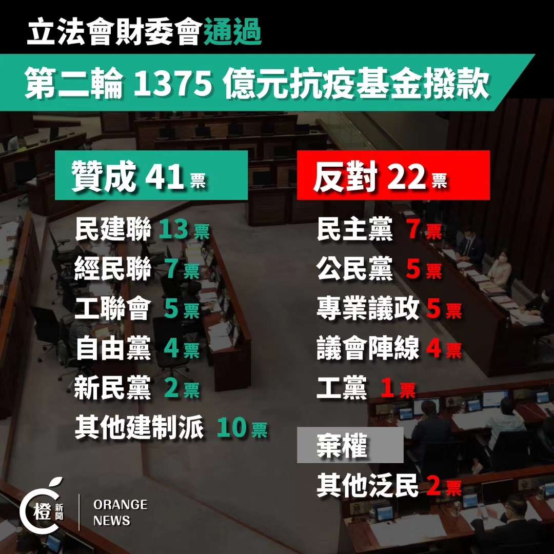 【香港商報網訊】香港立法會財務委員會經過約18小時的審議,今日下午2時半左右投票,以41票贊成、22票反對及2票棄權下,通過涉及1375億元的第二輪防疫抗疫基金撥款。期間,專業議政邵家臻及公民黨郭榮鏗一度投錯票,後又更正稱他們是反對撥款。