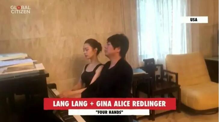 钢琴家郎朗先是与妻子吉娜表演了一曲四手联弹,又在压轴部分与席琳·迪翁、Lady Gaga、安德烈·波切利、约翰·传奇跨屏互动,合作表演《The Prayer》。但大家好像更好奇朗朗家的黄色沙发。